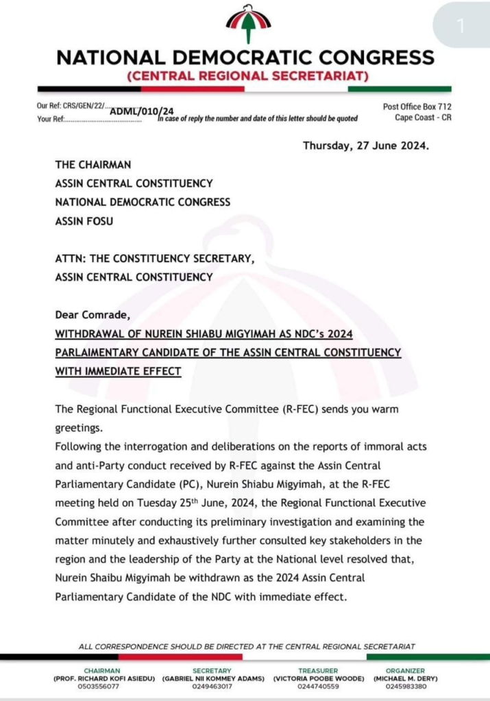 “The Regional Functional Executive Committee, after conducting its preliminary investigation and examining the matter minutely and exhaustively, further consulted key stakeholders in the region and the leadership of the Party at the National level resolved that Nurein Shaibu Migyimah be withdrawn as the 2024 Assin Central Parliamentary Candidate of the NDC with immediate effect,” the letter said.
