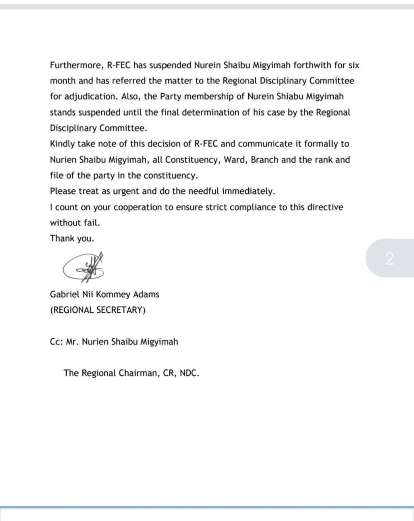 The party has also suspended Mr Migyimah for six months pending the matter’s adjudication at the Regional Disciplinary Committee.