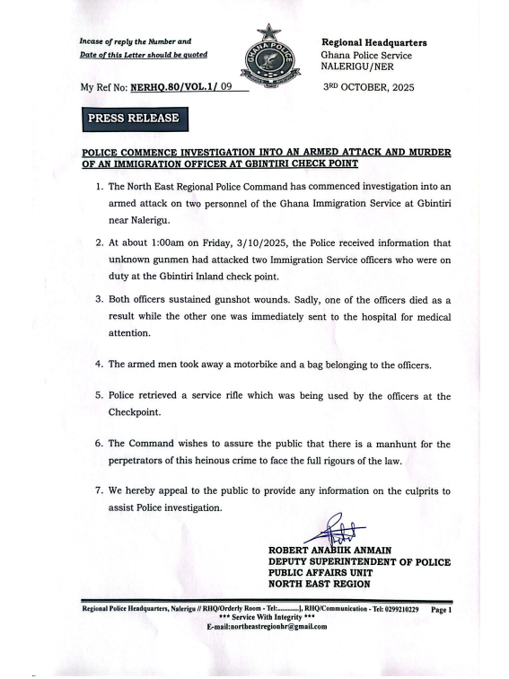The North East Regional Police Command has launched an investigation into the deadly armed attack on two Ghana Immigration Service officers stationed at the Gbintiri Inland Checkpoint near Nalerigu in the North East Region.