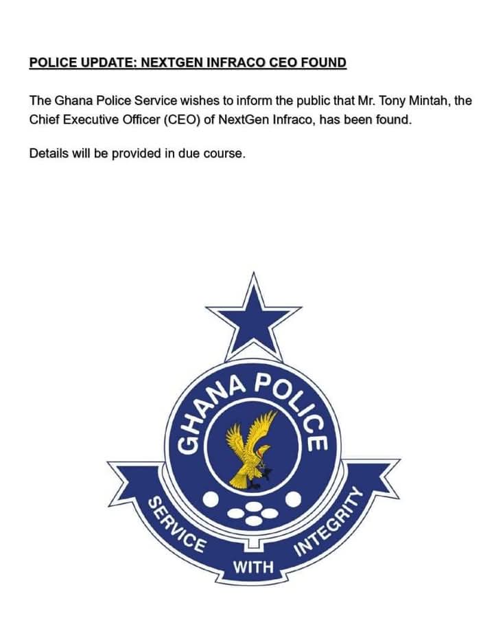 The Ghana Police Service has found the whereabouts of the CEO of NextGen InfraCo, Tony Mintah, who went missing, prompting a search.