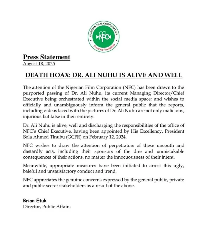 In a statement issued on August 18 and signed by the Agency’s Director of Public Affairs, Brian Etuk, the NFC confirmed that Ali Nuhu is alive and actively discharging his responsibilities as Chief Executive, stating that the claims are untrue.