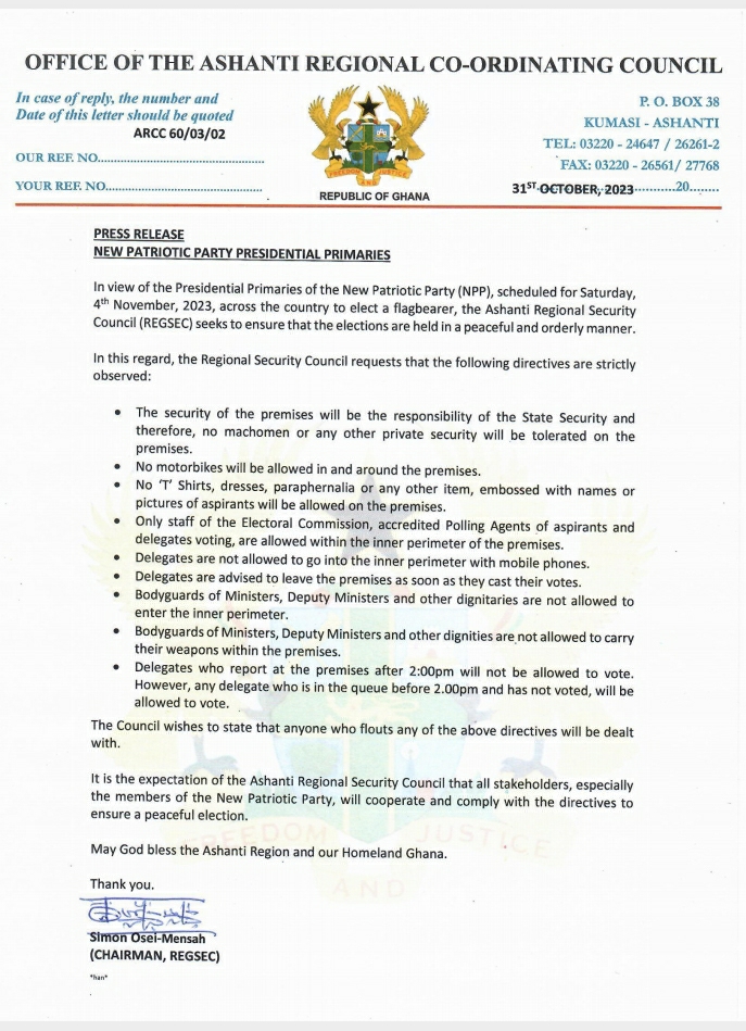 “It is the expectation of the Ashanti Regional Security Council that all stakeholders, especially the members of the New Patriotic Party, will cooperate and comply with the directives to ensure a peaceful election”, the statement added.