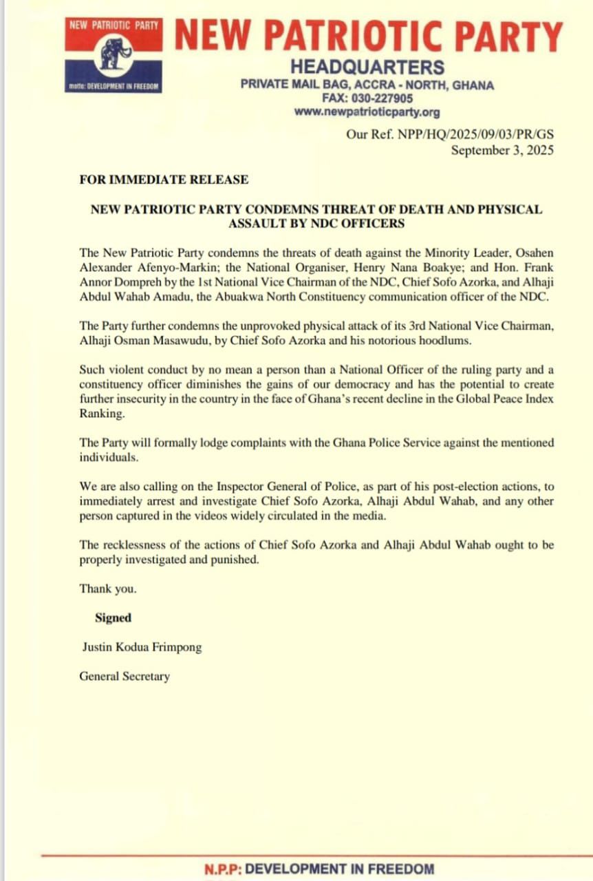 In a statement issued by the General Secretary, Justin Kodua Frimpong, on September 3, 2025, the NPP accused the NDC’s First National Vice Chairman, Chief Sofo Azorka, and the party’s Abuakwa North Constituency Communication Officer, Alhaji Abdul Wahab Amadu, of threatening Minority Leader Alexander Afenyo-Markin, National Organiser Henry Nana Boakye, and MP for Nsawam-Adoagyiri Frank Annor Dompreh.