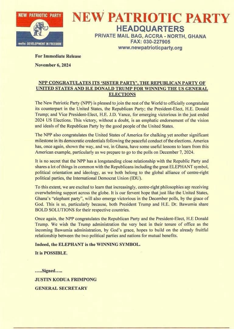 “This is so, particularly because both President Trump and H.E. Dr. Bawumia share BOLD SOLUTIONS for their respective countries. Once again, the NPP congratulates the Republican Party and the President-Elect, H.E Donald Trump,” excerpts of the statement highlighted.