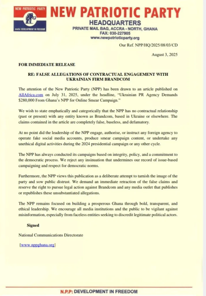 The New Patriotic Party (NPP) has firmly refuted allegations regarding its supposed engagement with Brandcom, a PR firm based in Ukraine.