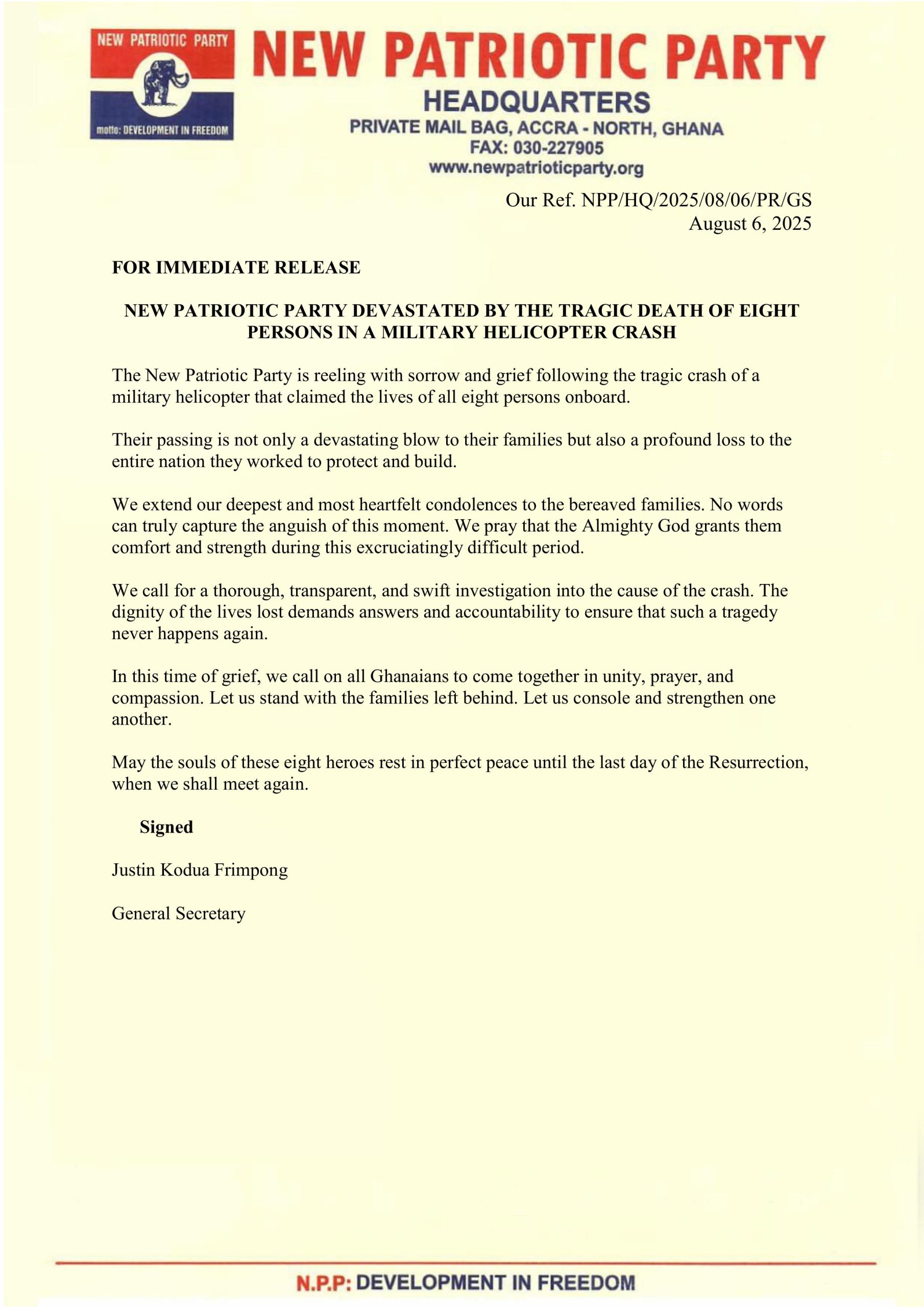 In a statement signed by General Secretary Justin Kodua Frimpong, the party conveyed its deepest condolences to the families affected by the tragedy. The statement also called for unity in the face of sorrow.