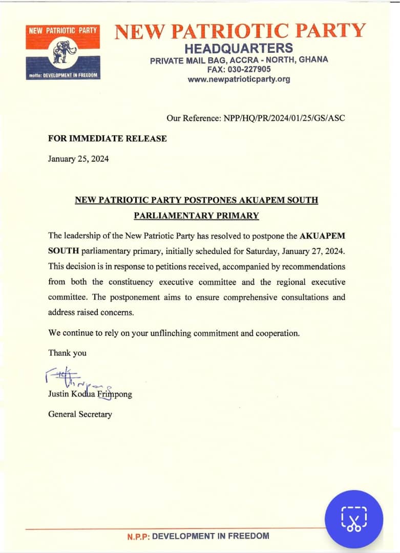 The New Patriotic Party (NPP) has postponed its parliamentary primary in the Akuapem South constituency initially scheduled for January 27, 2024.
