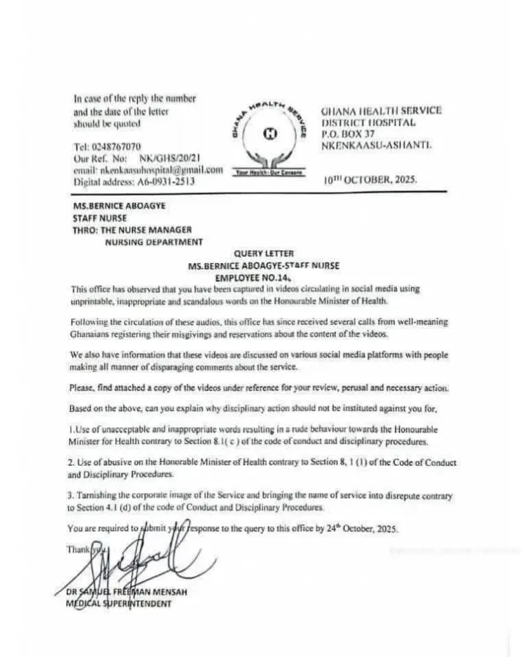 A staff nurse at the Nkenkaasu District Hospital, located in the Ashanti Region, Ms. Bernice Aboagye, has received a formal query from the hospital management following her alleged appearance in videos that have been circulating on social media.