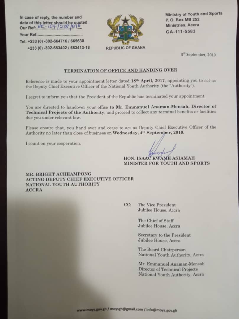 “I regret to inform you that the President of the Republic has terminated your appointment,” extracts of the letter available to The Ghana Report reads.