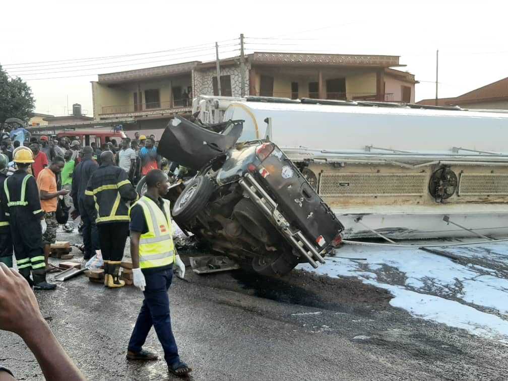 According to reports, the 54,000-litre diesel tanker was on its way to offload the fuel at the Bulk Oil Storage and Transportation (BOST) when it somersaulted and landed on a pickup heading towards Ahinsan.