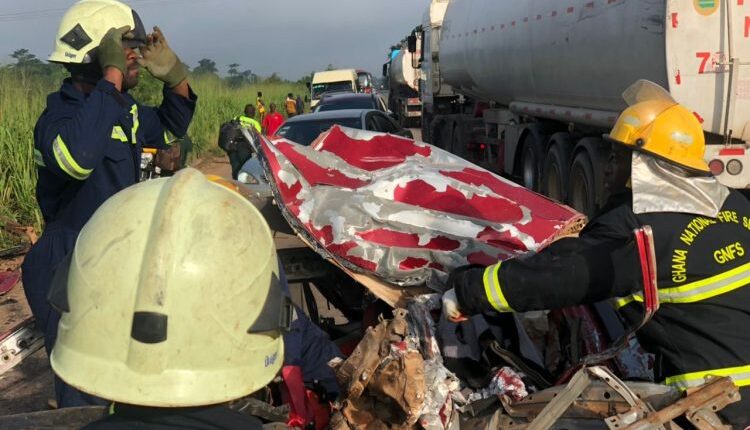 The accident occurred around 7:00 am when a Man Diesel tanker truck (No GT-5894-24) traveling from Accra to Kumasi collided with a Toyota Camry (No AW-6414-14) traveling from Kumasi to Accra.