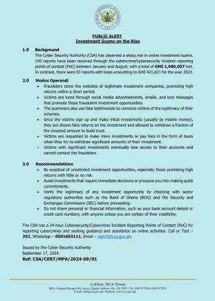 The Cyber Security Authority (CSA) has issued a public alert due to a sharp increase in online investment scams in Ghana, with losses surpassing GH¢1.9 million in 2024.