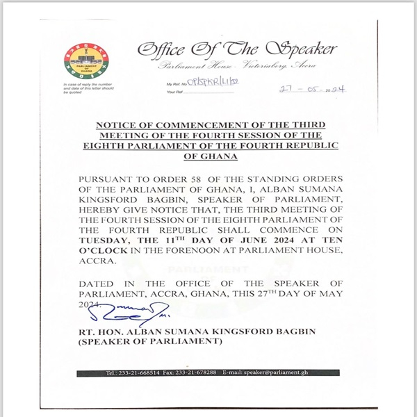 “Pursuant to Order 58 of the standing orders of the Parliament of Ghana, I, Alban Sumana Kingsford Bagbin, Speaker of Parliament, hereby give notice that the third meeting of the fourth session of the eighth Parliament of the Fourth Republic shall commence on Tuesday, the 11th day of June 2024 at ten o’clock in the forenoon at Parliament House, Accra.”