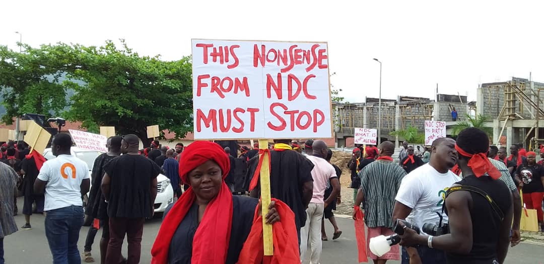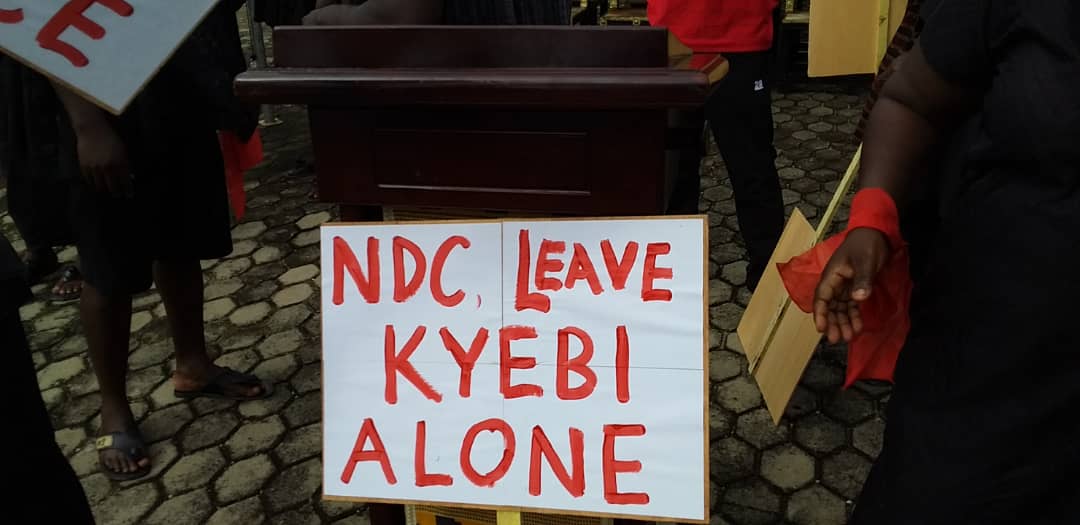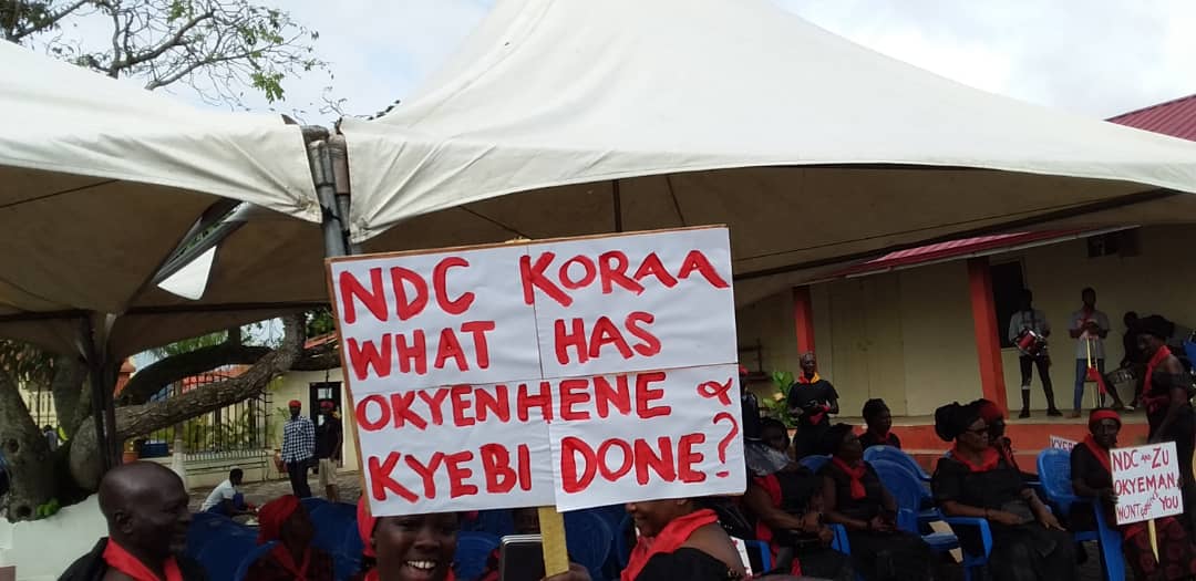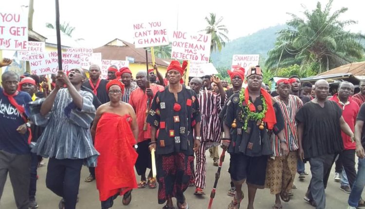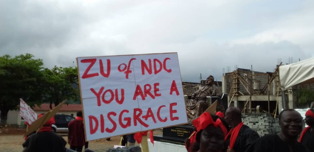 The people of Kyebi in the Akyem Abuakwa traditional area of the Eastern region are protesting against the Ashanti Regional Secretary of the National Democratic Congress (NDC), Kwame Zu for his abusive and provocative statements directed at the Okyehene, Osagyefuo Amoatia Ofori Panin.