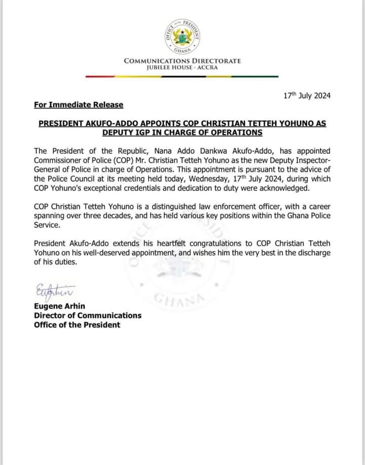 “This appointment is pursuant to the advice of the Police Council at its meeting held today, Wednesday, 17th July 2024, during which COP Yohuno’s exceptional credentials and dedication to duty were acknowledged.