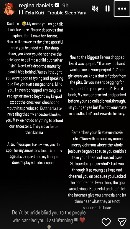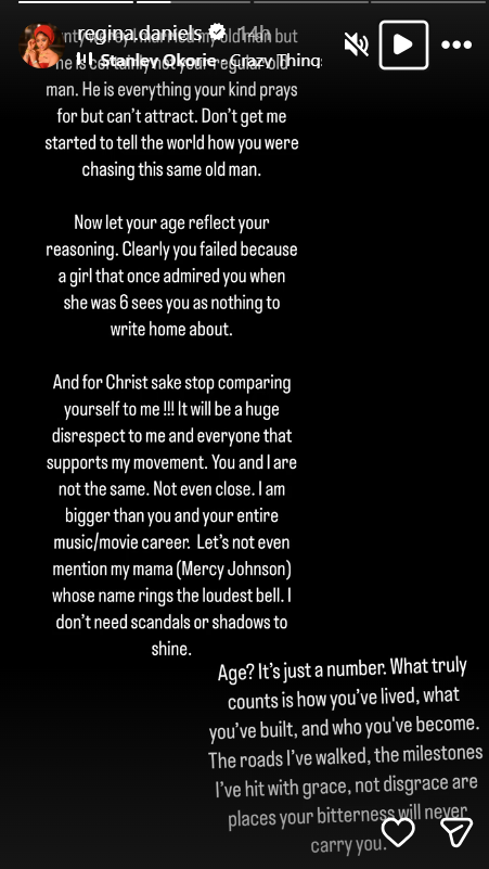 By claiming that Angela Okorie once tried to chase the same “old man” she now calls her husband, Regina not only flipped the narrative but weaponised the very thing critics have mocked her for: her age-gap marriage.