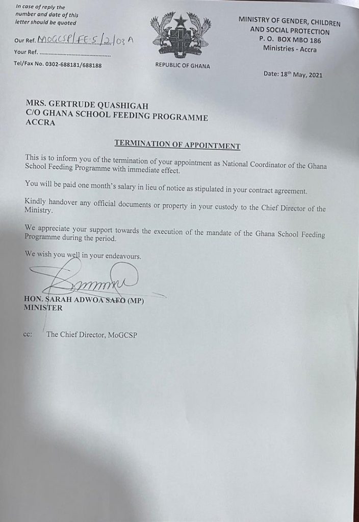 The Minister of Gender, Children and Social Protection Sarah Adwoa Safo has reinstated Gertrude Quashigah as the National Coordinator of the Ghana School Feeding Programme.