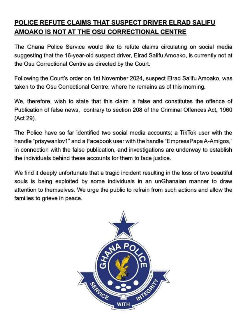 The Ghana Police Service has refuted viral social media claims suggesting that Elrad Salifu Amoako, the 16-year-old suspect driver involved in a fatal accident, is not in custody at the Osu Correctional Centre.