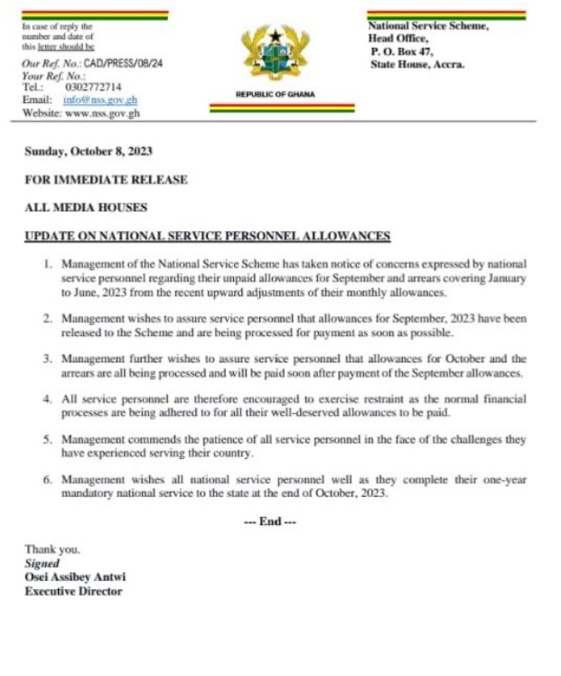 The statement issued by the NSS on Sunday, October 8, follows concerns raised by its personnel regarding the delayed disbursement of their September allowances and the arrears covering the period from January to June 2023.