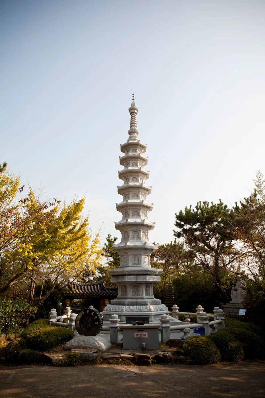 After walking the traditional 108 steps into the temple, passing the statues of the 12 animals representing the Chinese zodiac, visitors will spot a tall white pagoda to the left. Signs in Korean and English label it the Traffic Safety Pagoda.