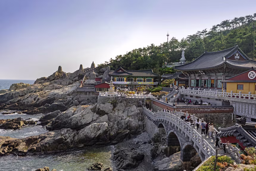 Perched along a craggy rock overhang, the ornate Buddhist temple provides sweeping views of the sea, making it a popular place to watch the sun rise against the beauty of Busan, South Korea’s second-largest city.