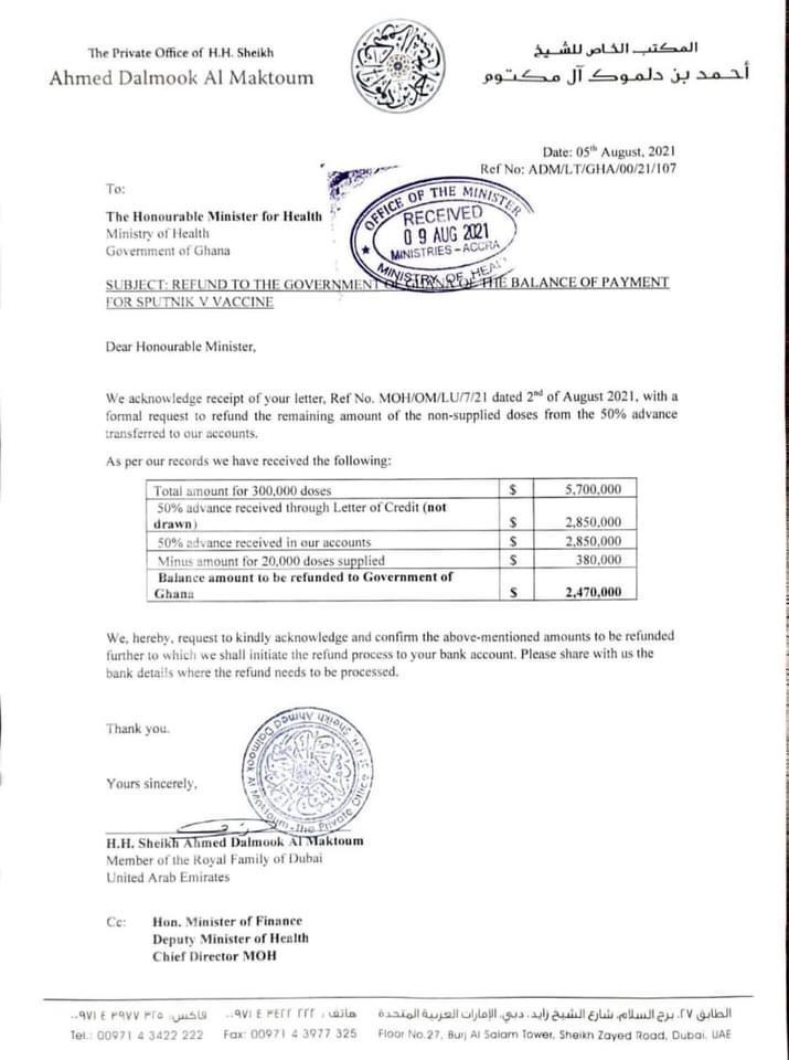 The intermediary contacted by the Ministry of Health for the botched procurement of 300,000 doses of Sputnik V vaccine, Sheikh Ahmed Dalmook Al Maktoum, has agreed to refund an amount of $2,470,000 to Ghana.