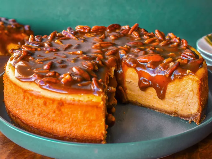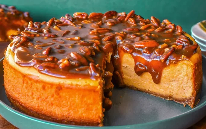 This sweet potato cheesecake has a smooth, creamy texture with a buttery crumb crust and delectable pecan praline topping. Perfect for a rich and flavorful dessert.