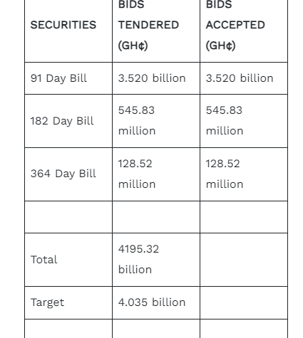 According to the auction results by the Bank of Ghana, the government got GH¢4.195 billion from the sale of the short-term instruments as against a target of GH¢4.035 billion.