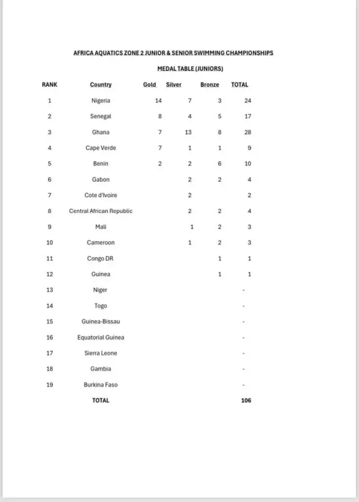 In the junior category, Ghana finished third with 28 medals, including 7 golds, while Nigeria topped with 24 medals, 14 of them gold.