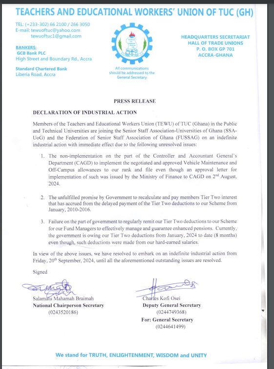 The Teachers and Educational Workers Union (TEWU) of the Trades Union Congress (TUC) has declared an indefinite strike effective Friday, September 20, 2024.