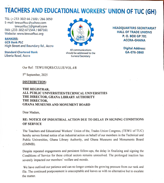 The Teachers and Educational Workers’ Union (TEWU) of the Trades Union Congress (TUC) has declared an industrial action set to begin on Thursday, September 19, 2025.