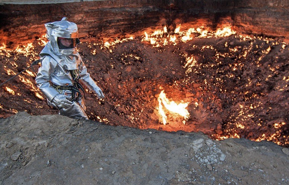 The Darvaza gas crater, also known as the Door to Hell, is a natural gas field in Turkmenistan that collapsed into a cavern and has been burning since the 1980s. The exact cause of its formation is uncertain, with some theories suggesting it was created in the 1960s and set on fire in the 1980s to prevent the spread of poisonous gases. Others believe Soviet engineers accidentally caused the collapse while drilling for oil in 1971 and then set it on fire. The crater, located near the village of Darvaza in the Karakum Desert, is about 60-70 meters in diameter and around 30 meters deep. Turkmenistan’s President Gurbanguly Berdimuhamedow has expressed intentions to extinguish the crater due to its harmful effects on health, the environment, and the natural gas industry. Despite these plans, the crater remains open and burning. It has become a minor tourist attraction, with visitors drawn to its fiery spectacle. In 2013, explorer George Kourounis became the first person to descend to the bottom of the crater, collecting soil samples for scientific research.
