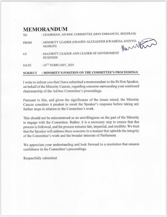 “Pursuant to this, and given the significance of the issues raised, the Minority Caucus considers it prudent to await the Speaker’s response before taking any further steps in relation to the Committee’s work,” the memo copied to the ad-hoc committee chairman, Emmanuel Bedzrah, read.