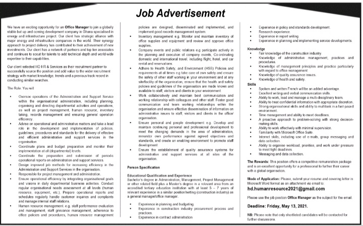 Prospective job seekers can find below the advertised jobs in the April 29, 2021, edition of Daily Graphic as published in the paper today.