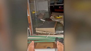 A video she managed to film briefly using the light on her phone, now shared with the BBC, shows the space where she thought her life might end – and how surging sea water and floating debris prevented her escape.