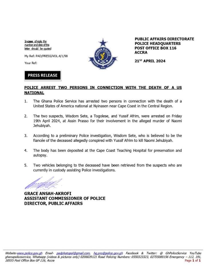 Preliminary investigations suggest that Wisdom Sete, who is believed to be the deceased’s fiancé, conspired with Yussif Afrim in the alleged murder of Naomi Jehubiyah.