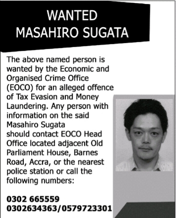 The two — Masahiro Sugata and Akwesi Abebi — are also wanted for offences including fraud, tax evasion and money laundering.