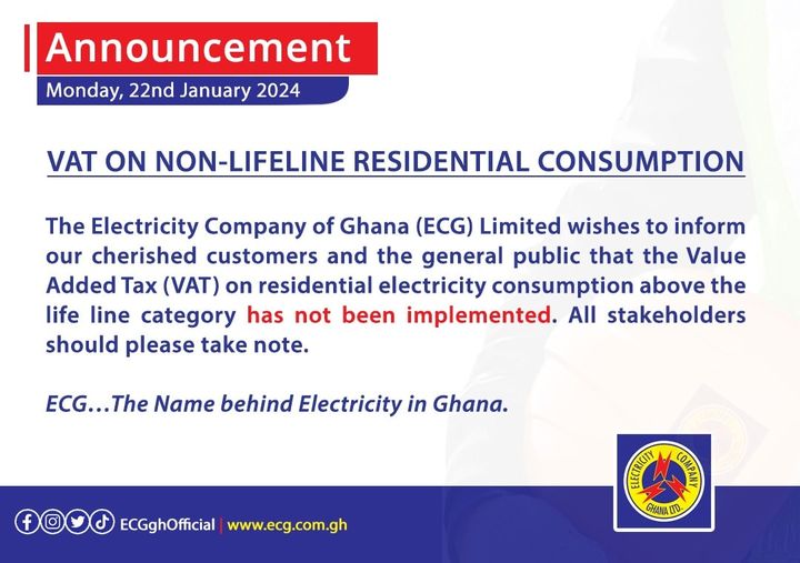 The Electricity Company of Ghana(ECG) has announced that the Value Added Tax(VAT) on residential electricity consumption above the lifeline category has not been implemented.