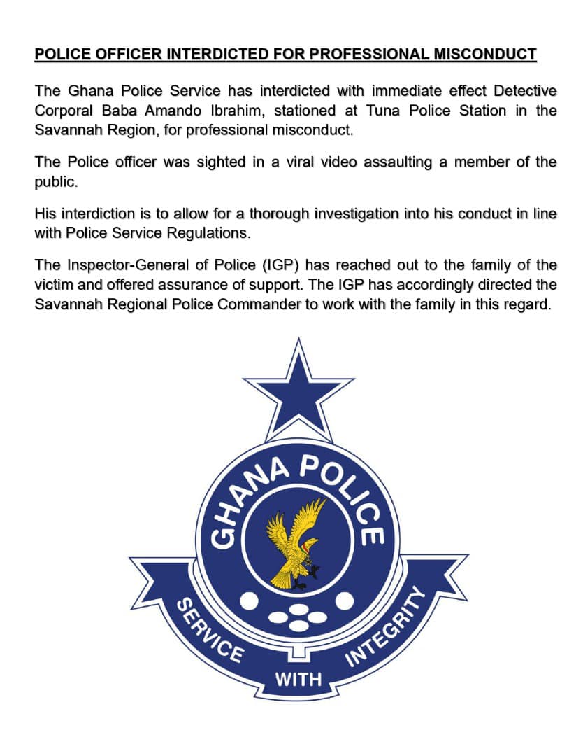 The Ghana Police Service has interdicted Detective Corporal Baba Amando Ibrahim over a viral video showing him mistreating a handcuffed man.