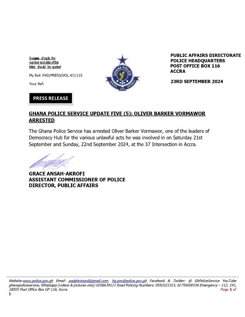 Convener of the Democracy Hub, Oliver Barker-Vormawor, has been arrested by the Ghana Police Service in connection with the recent protests organised by the group in Accra.