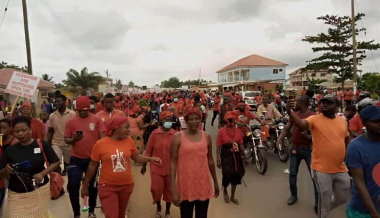The demonstrators who were clad in red and black attire were seen holding placards with inscriptions such as “Mie Fu Kpem” meaning “we are suffering”, as they chanted war songs on Friday, August 27.