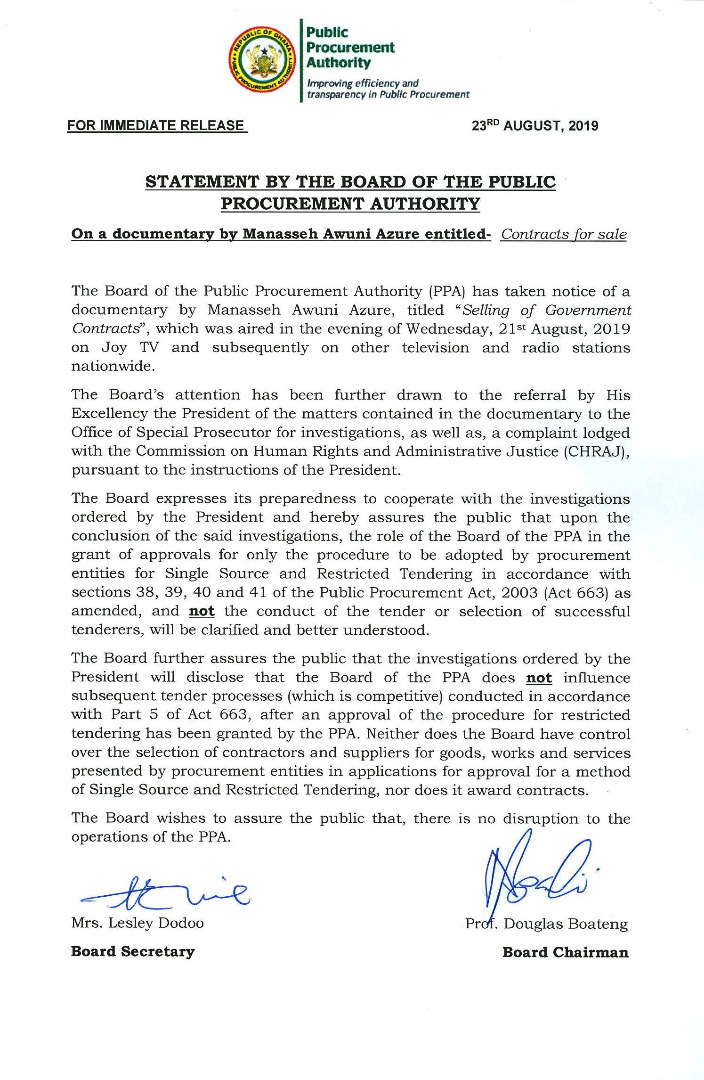 “The Board expresses its preparedness to cooperate with the investigations. PPA hereby assures the public that upon the conclusion of the said investigations, the role of the Board of the PPA in the granting of approvals for Restricted tendering and Single Source procurement in accordance with sections 38, 39, 40 and 41 respectively of the Public Procurement Act, 2003 (Act 663] as amended will be understood.