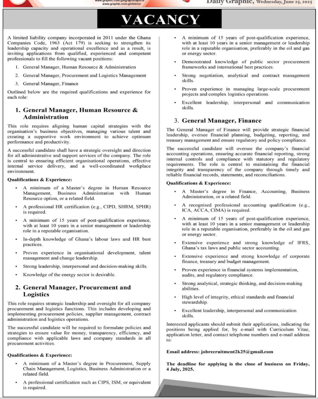 Prospective job seekers can find below the advertised jobs in the June 25, 2025, edition of the Daily Graphic as published in the paper today.