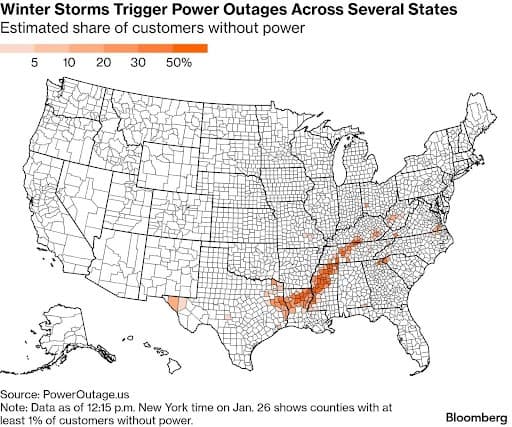 – Arctic Storm Fern has curbed electricity supply to millions of people across the eastern two-thirds of the United States, slashing oil supply by 2 million b/day, gas production by more than 10 bcf/day and sending power prices skyrocketing.