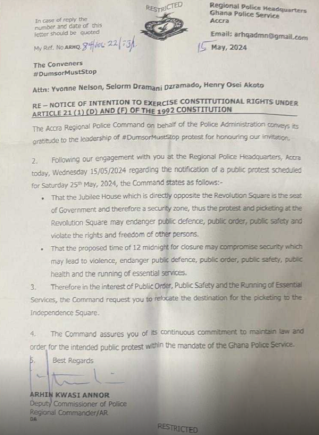 The police have directed the conveners of the ‘#DumsorMustStop’ demonstration to stage their protests at Independence Square instead of the planned Revolution Square.