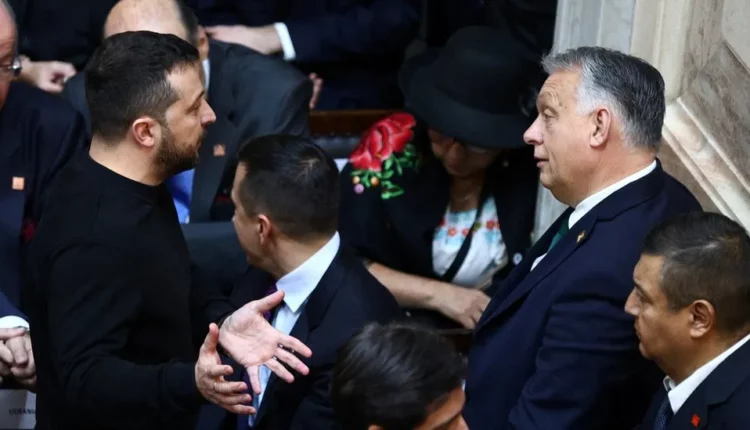 President Volodymyr Zelensky has had a brief – but intense-looking – conversation with the man threatening to block Ukraine’s EU aspirations.
