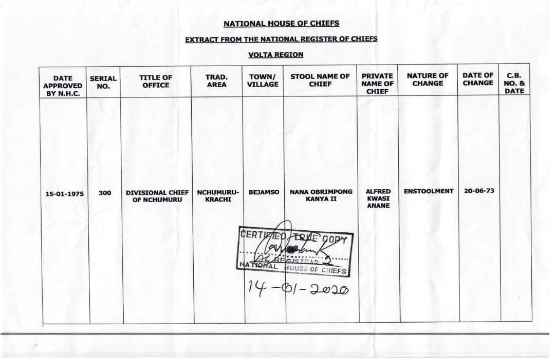 It also stated that the Bejamsehene is a Divisional Chief adding that a search conducted at the Registry of the National House of Chiefs, which result theghanareport.com has, showed that the Bejamsehene is a Divisional Chief of Nchumuru in the Krachi-Nchumuru Traditional Area and, therefore, not qualified to be given a Traditional Council.