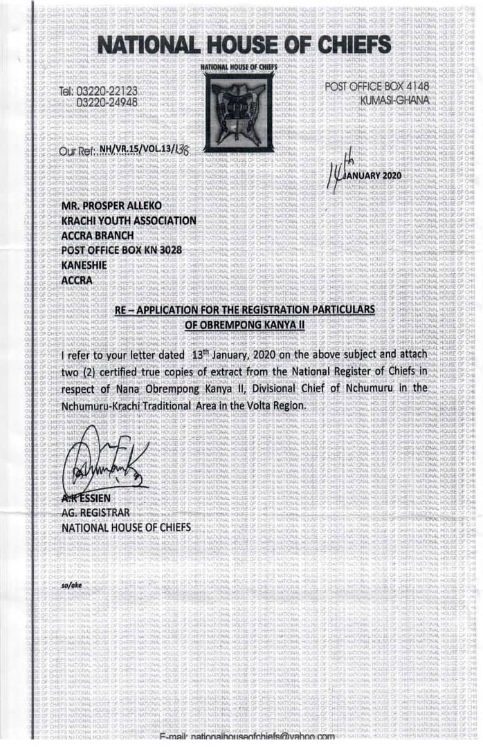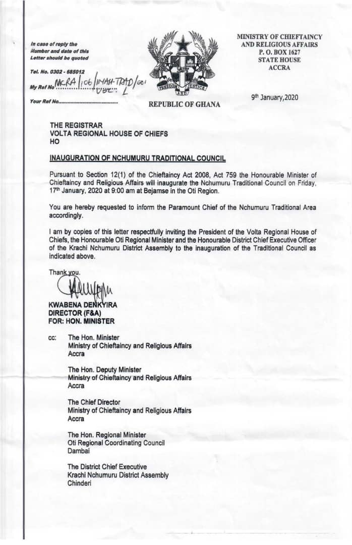 In the said letter, the Director of the Ministry of Chieftaincy and Religious Affairs urged the Registrar of the Volta Regional House of Chiefs to inform the Paramount Chief of the Nchumuru Traditional Area about the event. The Oti Region is yet to have its own Regional House of chiefs after its creation in 2019.