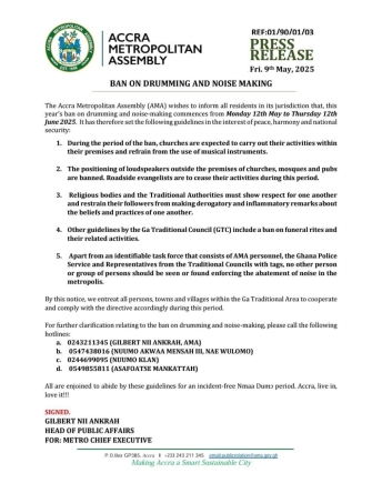 Additionally, a designated task force made up of AMA personnel, members of the Ghana Police Service, and accredited representatives from the Traditional Councils, wearing official identification, will patrol various places to ensure full compliance with the directive.
