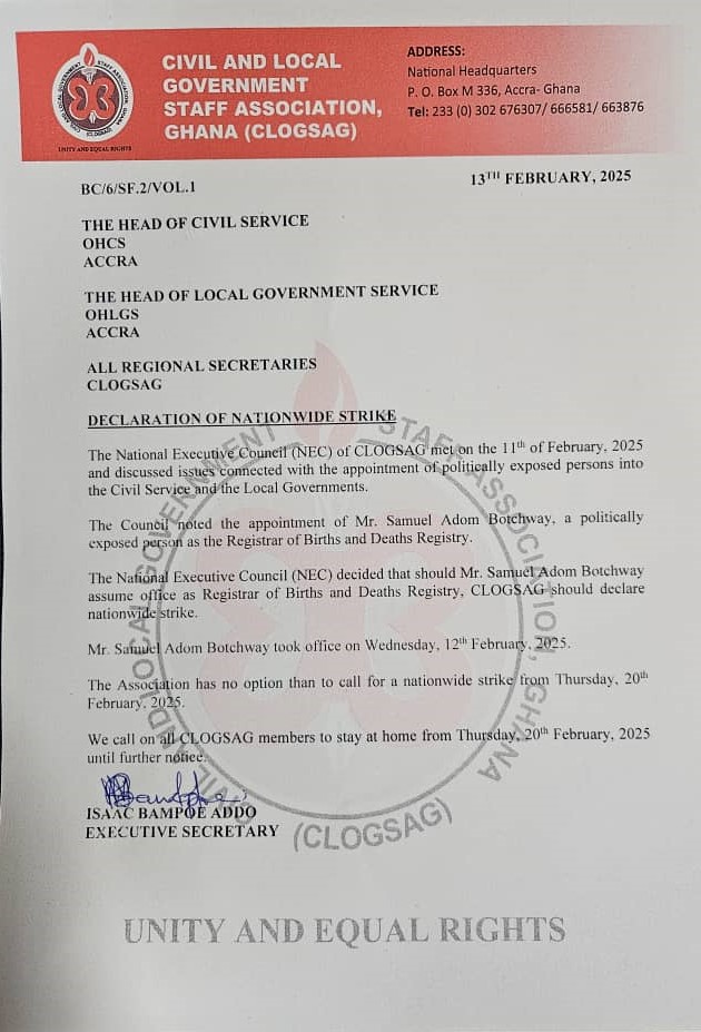 The Civil and Local Government Staff Association, Ghana (CLOGSAG), has announced a nationwide strike following the appointment of Samuel Adom Botchway as the new Registrar of the Births and Deaths Registry.